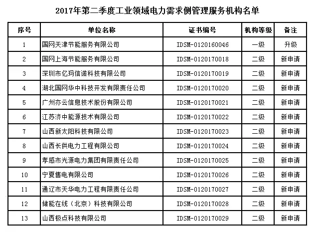 附件:2017年第二季度工業(yè)領(lǐng)域電力需求側(cè)管理服務(wù)機構(gòu)名單