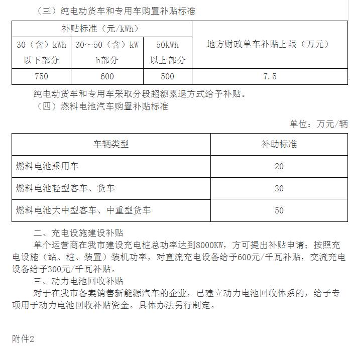對取得我市交通運輸管理部門營運許可的純電動貨車和專用車,按照中央單車購置補貼標準的50%,以提供驅動動力的動力電池總儲電量為依據(jù),采取分段超額累退方式給予補貼。
