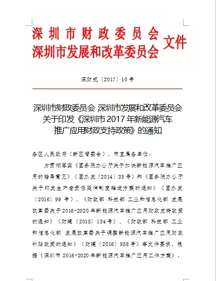 為貫徹落實《國務院辦公廳關于加快新能源汽車推廣應用的指導意見》(國辦發(fā)〔2014〕35號)、《財政部 科技部 工業(yè)和信息化部 發(fā)展改革委關于2016-2020年新能源汽車推廣應用財政支持政策的通知》(財建〔2015〕134號)和《財政部 科技部 工業(yè)和信息化部 發(fā)展改革委關于調整新能源汽車推廣應用財政補貼政策的通知》(財建〔2016〕958號)等文件精神,現(xiàn)制定深圳市2017年新能源汽車推廣應用財政支持政策如下: