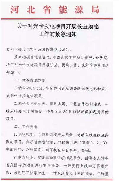 ■ 弄虛作假取消并網(wǎng)指標(biāo) 河北能源局下發(fā)《對(duì)光伏發(fā)電項(xiàng)目開展核查摸底工作》的通知
