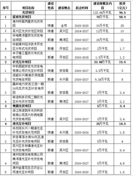 浙江省湖州市發(fā)改委印發(fā)《湖州市能源發(fā)展“十三五”規(guī)劃》,計(jì)劃到2020年光伏裝機(jī)容量達(dá)130萬千瓦。積極推進(jìn)“百萬家庭屋頂光伏計(jì)劃”,到2020年,力爭建成10萬戶家庭屋頂光伏。湖州市“十三五”重大能源項(xiàng)目(光伏)