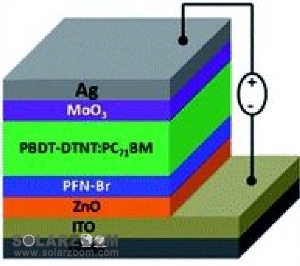 由于在傳統(tǒng)體異質(zhì)結(jié)型聚合物太陽電池采用ITO/PEDOT:PSS/BHJ/Ba(Al)結(jié)構(gòu)中,酸性磺化聚苯(PSS)摻雜的聚噻吩衍生物(PEDOT)對ITO有腐蝕作用,而且銦離子的擴(kuò)散會影響器件性能。在華南理工大學(xué)楊庭斌博士、華南理工大學(xué)材料學(xué)院黃飛教授、阿克倫大學(xué)龔雄助理教授等研究人員的共同努力下,通過采用倒置結(jié)構(gòu),省去了原有的PEDOT:PSS層,可以有效提高電池的穩(wěn)定性。研究人員采用ITO/ZnO/PFN-Br/PBDT-DTNT:PC71BM/MoO2/Ag結(jié)構(gòu)制作電池開路電壓0.75V,短路電流17.4mA/cm2,填充因子61%,轉(zhuǎn)化效率8.4%。