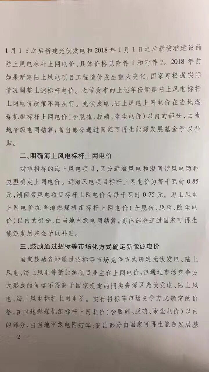 文件還對(duì)陸上風(fēng)電標(biāo)桿上網(wǎng)電價(jià)作出調(diào)整,2018年1月1日之后,一類(lèi)至四類(lèi)資源區(qū)新核準(zhǔn)建設(shè)陸上風(fēng)電標(biāo)桿上網(wǎng)電價(jià)分別調(diào)整為每千瓦時(shí)0.40元、0.45元、0.49元、0.57元,比2016-2017年電價(jià)每千瓦時(shí)降低7分、5分、5分、3分。海上風(fēng)電標(biāo)桿電價(jià)不作調(diào)整。