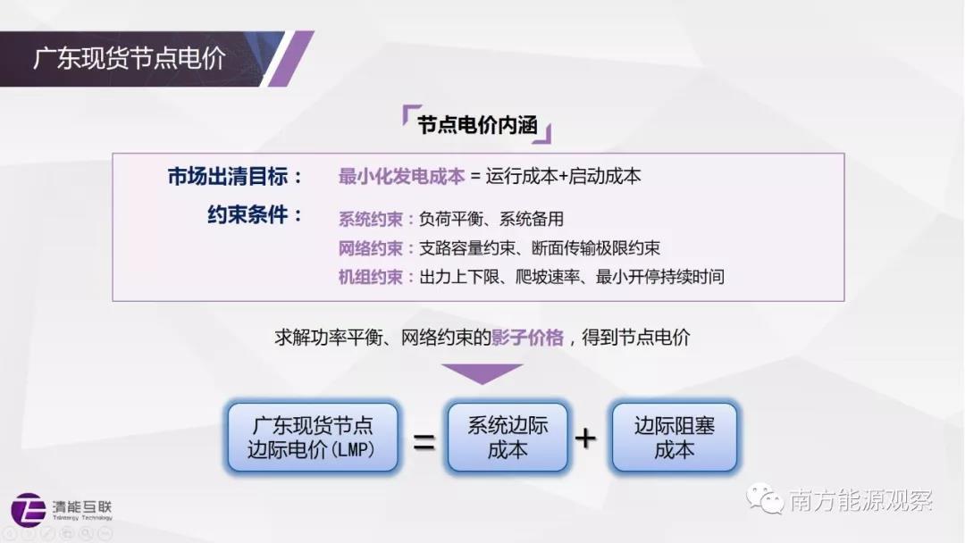 南方(以廣東起步)現(xiàn)貨市場(chǎng)的節(jié)點(diǎn)電價(jià)將由系統(tǒng)電能價(jià)格和阻塞價(jià)格構(gòu)成。系統(tǒng)電能價(jià)格反映全市場(chǎng)的電力供需情況,阻塞價(jià)格反映節(jié)點(diǎn)所在位置的電網(wǎng)阻塞情況。當(dāng)網(wǎng)絡(luò)傳輸出現(xiàn)阻塞時(shí),市場(chǎng)將會(huì)“拆分”為多個(gè)分區(qū),使得不同地理位置的邊際價(jià)格產(chǎn)生差異,偏離“無(wú)網(wǎng)絡(luò)約束”狀態(tài)下的邊際機(jī)組申報(bào)價(jià)格。節(jié)點(diǎn)電價(jià)的內(nèi)在機(jī)理非常復(fù)雜,一般而言,負(fù)荷大小和分布、發(fā)電側(cè)報(bào)價(jià)、發(fā)電機(jī)組物理參數(shù)、網(wǎng)絡(luò)傳輸能力是影響節(jié)點(diǎn)電價(jià)的主要因素。因此,市場(chǎng)主體在參與現(xiàn)貨市場(chǎng)申報(bào)時(shí),需要結(jié)合市場(chǎng)運(yùn)營(yíng)機(jī)構(gòu)公布的運(yùn)行信息進(jìn)行分析決策。
