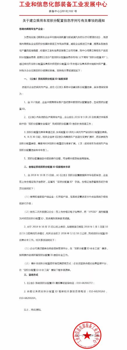 同時(shí),對(duì)于312批次前生產(chǎn)的在《公告》內(nèi)有效的乘用車,相關(guān)企業(yè)應(yīng)在2018年9月20日前通過(guò)申報(bào)系統(tǒng)中的“雙積分配置補(bǔ)全模塊”完成雙積分配置ID信息補(bǔ)充創(chuàng)建工作。