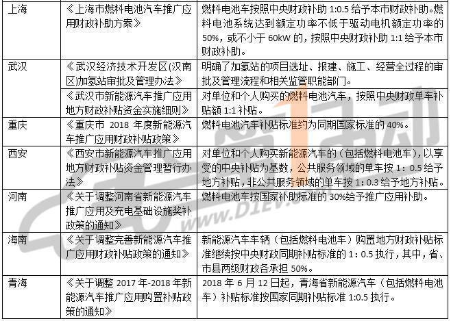 在10個省市出臺的燃料電池政策中,廣東明確將大力推進(jìn)燃料電池汽車產(chǎn)業(yè)化,而且明確了將省級補貼資金的30%用于支持燃料電池。廣東佛山的補貼力度最大,最高補貼可達(dá)800萬元。武漢按中央1:1補貼;上海、海南、青海按中央1:0.5補貼;重慶按中央1:0.4補貼;河南按中央1:0.3補貼。