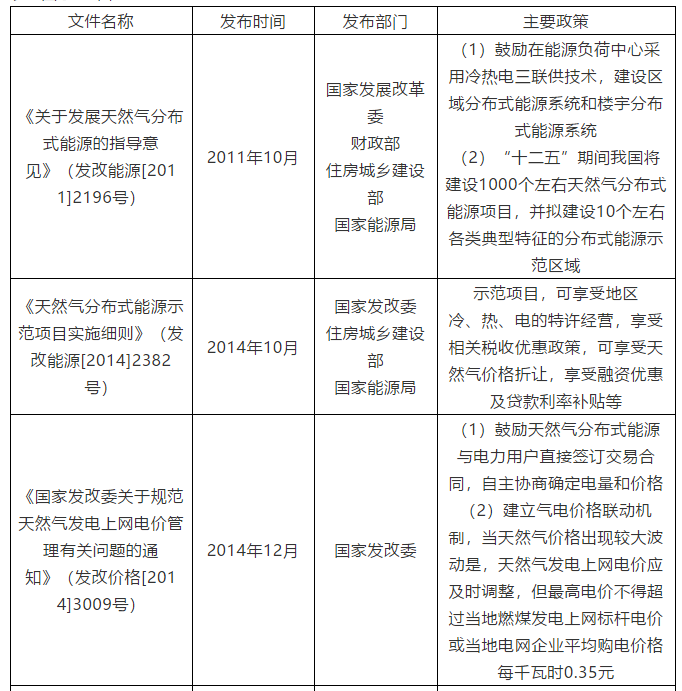 國(guó)家層面對(duì)于天然氣發(fā)電及燃?xì)饴?lián)供項(xiàng)目有明確補(bǔ)貼支持和數(shù)量要求的政策性文件主要如下表1所示。