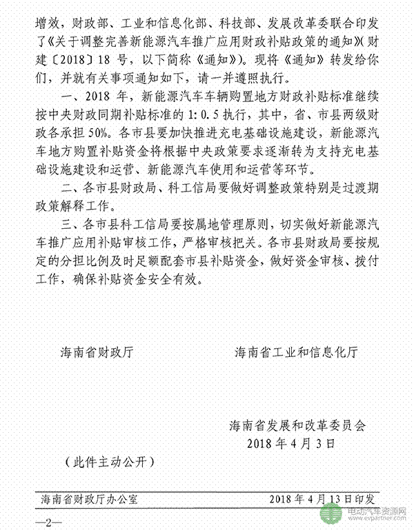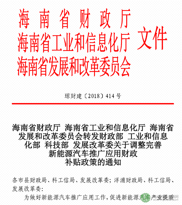 中國儲能網(wǎng)訊:海南省轉(zhuǎn)發(fā)四部委發(fā)布的《關于調(diào)整完善新能源汽車推廣應用財政補貼政策的通知》,對海南省新能源汽車地補做出規(guī)定和解釋。2018年,新能源汽車車輛購置地方財政補貼標準繼續(xù)按中央財政同期補貼標準的1:0.5執(zhí)行,其中,省、市縣兩級財政各承擔50%。各市縣要加快推進充電基礎設施建設,新能源汽車地方購置補貼資金將根據(jù)中央政策要求逐漸轉(zhuǎn)為支持充電基礎設施建設和運營、新能源汽車使用和運營等環(huán)節(jié)。