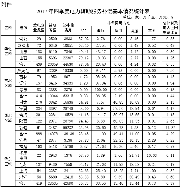 2017年四季度,全國除西藏、蒙西地區(qū)外30個(gè)省(區(qū)、市、地區(qū))參與電力輔助服務(wù)補(bǔ)償?shù)陌l(fā)電企業(yè)共3123家,裝機(jī)容量共11.63億千瓦,補(bǔ)償費(fèi)用共35.18億元,占上網(wǎng)電費(fèi)總額的0.81%(詳見附件)。