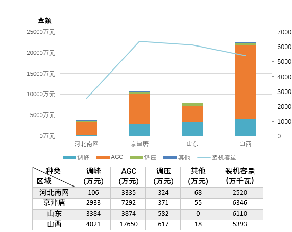 圖7華北區(qū)域分省(地區(qū))電力輔助服務(wù)補(bǔ)償分項(xiàng)費(fèi)用情況