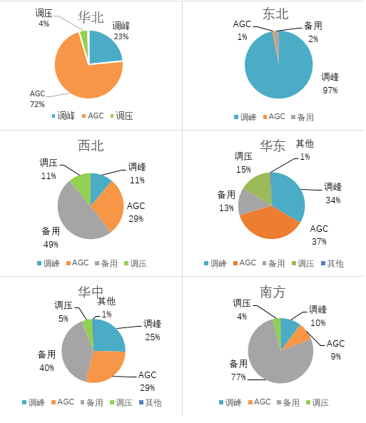 從分項(xiàng)電力輔助服務(wù)補(bǔ)償費(fèi)用來看,調(diào)峰、AGC和備用補(bǔ)償費(fèi)用占總補(bǔ)償費(fèi)用的90%以上。其中,西北、東北區(qū)域調(diào)峰補(bǔ)償力度最大,華北、華東區(qū)域調(diào)頻(西北區(qū)域調(diào)頻為AGC加一次調(diào)頻,其他區(qū)域調(diào)頻為AGC)補(bǔ)償力度最大,南方、華中區(qū)域備用補(bǔ)償力度最大。總體來看,西北區(qū)域整體電力輔助服務(wù)補(bǔ)償力度最大(見圖3)。