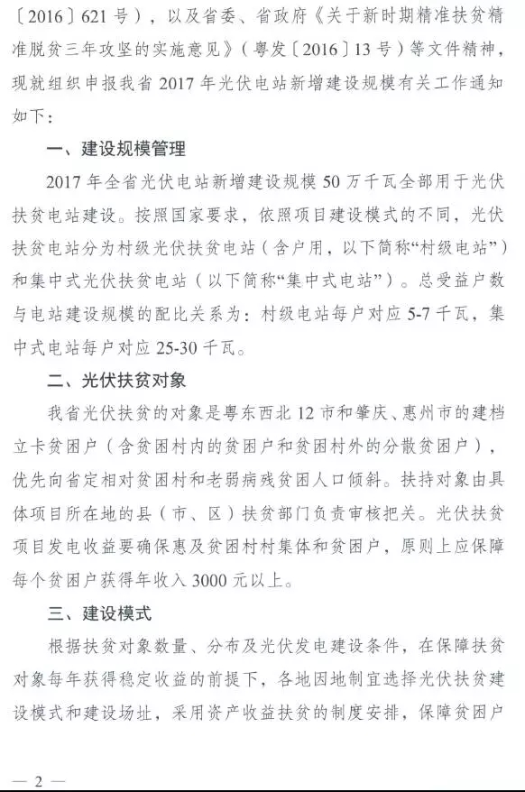 中國儲(chǔ)能網(wǎng)訊:近日,廣東省發(fā)改委和廣東省扶貧辦聯(lián)合發(fā)布《組織申報(bào)2017年光伏電站新增建設(shè)規(guī)模的通知》,要求2017年500MW新增建設(shè)規(guī)模全部用于光伏扶貧,其中村級(jí)電站每戶對(duì)應(yīng)5-7千瓦、集中式電站每戶對(duì)應(yīng)25-30千瓦。指標(biāo)分配將優(yōu)先支持已建成、還未取得年度建設(shè)規(guī)模指標(biāo)的光伏扶貧項(xiàng)目;此外村級(jí)電站優(yōu)先納入建設(shè)規(guī)模。從地區(qū)上看,原中央蘇區(qū)、欠發(fā)達(dá)革命老區(qū)和少數(shù)民族地區(qū)以及國家綠色能源示范縣的光伏扶貧項(xiàng)目優(yōu)先納入建設(shè)規(guī)模。對(duì)于集中式電站,綜合考慮項(xiàng)目占地面積、項(xiàng)目用地性質(zhì)、項(xiàng)目用地和扶貧資金落實(shí)情況、縣級(jí)有關(guān)部門支持情況、電力消納和送出條件、綜合開發(fā)利用等因素,統(tǒng)籌安排建設(shè)規(guī)模。
