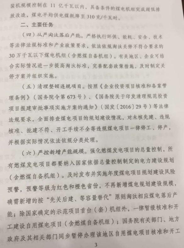 “十三五”期間,全國(guó)停建和緩建煤電產(chǎn)能1.5億千瓦,淘汰落后產(chǎn)能0.2億千瓦以上,實(shí)施煤電超低排放改造4.2億千瓦、節(jié)能改造3.4億千瓦、靈活性改造2.2億千瓦。到2020年,全國(guó)煤電裝機(jī)規(guī)??刂圃?1億千瓦以內(nèi),具備條件的煤電機(jī)組完成超低排放改造,煤電平均供電煤耗降至310克/千瓦時(shí)。
