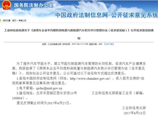 中國儲能網(wǎng)訊:6月13日,工信部網(wǎng)站和國務(wù)院法制辦公室網(wǎng)站同時發(fā)布了《乘用車企業(yè)平均燃料消耗量與新能源汽車積分并行管理辦法(征求意見稿)》(以下簡稱《辦法》),從標題可以看出,前段時間爭論許久的并行還是獨立的雙積分管理,最終確定了并行管理方式。