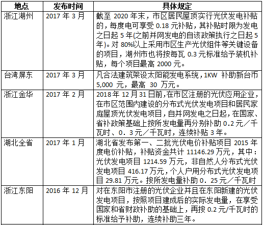 各地關(guān)于光伏補(bǔ)貼的政策文件層出不窮,記者將16年12月至今公開的文件進(jìn)行了匯總,通過(guò)整理發(fā)現(xiàn),多數(shù)省份分布式光伏的補(bǔ)貼標(biāo)準(zhǔn)在0.2元—0.3元/kW·h,具體規(guī)定有細(xì)微差別,詳情見下表: