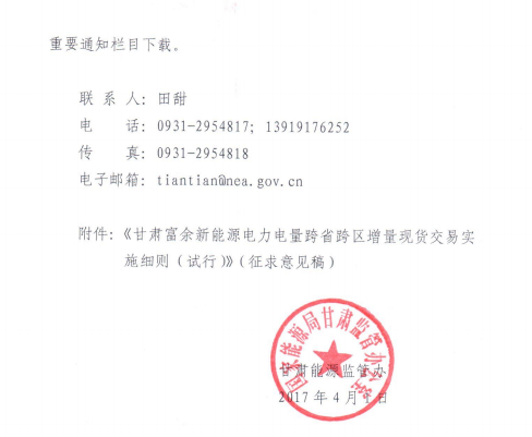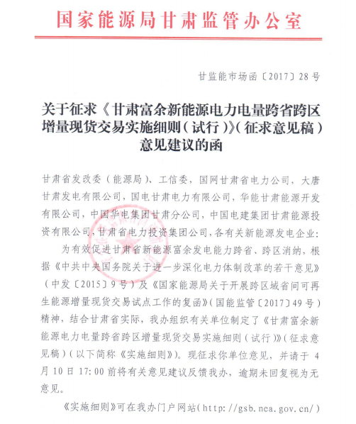 從國(guó)家能源局甘肅監(jiān)管辦公室獲悉,甘肅富余新能源電力電量跨省跨區(qū)增量現(xiàn)貨交易實(shí)施細(xì)則(試行)(征求意見稿)近日發(fā)布。
