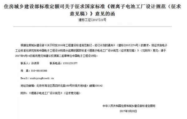 中國儲能網(wǎng)訊:3月21日,住房城鄉(xiāng)建設(shè)部標(biāo)準(zhǔn)定額司公布《鋰離子電池工廠設(shè)計規(guī)范(征求意見稿)》(以下簡稱《設(shè)計規(guī)范》),《設(shè)計規(guī)范》就鋰電池企業(yè)工廠設(shè)計的國家標(biāo)準(zhǔn)公開征求意見。