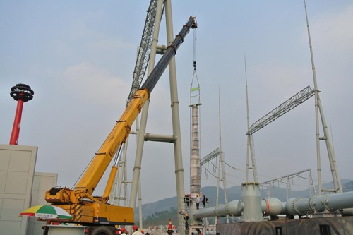 1000千伏浙北變電站是皖電東送淮南至上海特高壓交流示范工程的四個變電站之一,本期1000千伏出線4回。由于特高壓電壓等級高,對安全距離的要求更為嚴(yán)格。而套管作為絕緣體,能將導(dǎo)電部分嚴(yán)密包裹,使其與外界隔絕,因此套管的安裝是變電站安裝工程的重要環(huán)節(jié),本次安裝的套管長13.3米,重6.3噸。