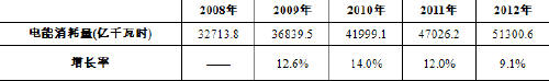 從中國全社會用電需求數(shù)據(jù)來看,近五年以來,中國全社會電力需求規(guī)模持續(xù)快速增長,2012年,中國電能消耗量超過5萬億千瓦時,較2011年增長9.1%。從2008年到2012年,中國電能消耗量年均復合增長率達到11.9%。未來三年,隨著經濟發(fā)展、城市建設進程加快,中國電力需求將繼續(xù)保持較高的增長速度,為智能電網的發(fā)展提供有效的市場保證。
