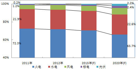圖 1 2011-2020年中國電能消耗結構及預測(按發(fā)電量統(tǒng)計)