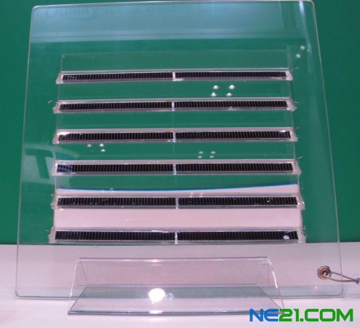 該太陽能電池模塊的制作原理是在棱鏡的一面粘貼太陽能電池單元,然后將其粘貼在透明的基板上。而此次采用的太陽能電池則是對其他公司的結晶硅型太陽能電池進行細致切割而成的。