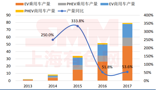 新能源汽車市場迎來產(chǎn)量、銷量雙爆發(fā)后繼續(xù)維持高速增長,2013-2015年新能源汽車實現(xiàn)爆發(fā)增長,產(chǎn)量逐年成倍攀升,2016年以來增長由爆發(fā)轉(zhuǎn)向平穩(wěn)高增,近兩年均維持50%以上的產(chǎn)量增速。