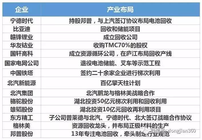 7月工信部公布的第一批動(dòng)力電池試點(diǎn)企業(yè)名單,從中央到地方綜合推進(jìn)動(dòng)力電池規(guī)范化的回收。從下表不難發(fā)現(xiàn),這幾家動(dòng)力電池企業(yè)都是新能源汽車主要的電池材料供應(yīng)商,具備專業(yè)的設(shè)備和人才進(jìn)行廢舊電池材料的處理能力。