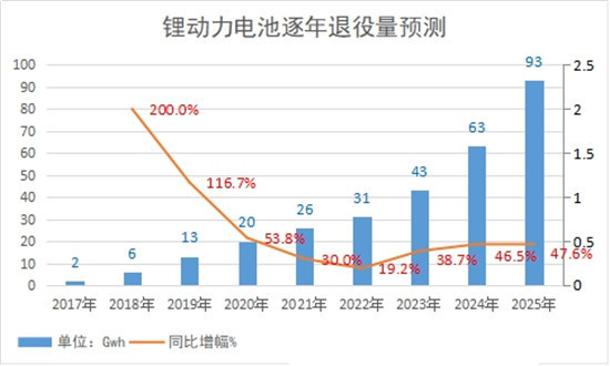 專業(yè)研究機(jī)構(gòu)發(fā)布報(bào)告稱,2020 年我國將有約 20Gwh 的動力電池退役,2025 年將有大約 93Gwh 的動力電池退役。由此帶來的電池回收利用規(guī)模在 2020 年將達(dá)到 107 億元左右。到 2025 年市場規(guī)模將達(dá)到 379 億元。由此可見,動力電池的回收利用將快速形成一個(gè)巨大的新興市場。