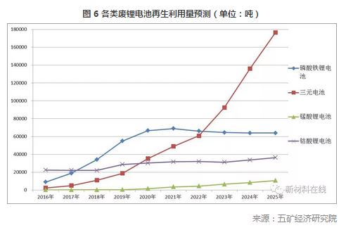 就鋰電池再生利用而言,可供再生利用的廢舊鋰電池來源不僅來自直接報(bào)廢的退役動(dòng)力電池,還有廢舊的消費(fèi)鋰電池、電池企業(yè)等的生產(chǎn)廢料、報(bào)廢的梯級(jí)利用電池等重要來源。經(jīng)過測算,未來 5 年內(nèi)主要的再生利用電池仍然是缺乏回收價(jià)值的磷酸鐵鋰電池。但三元?jiǎng)恿﹄姵氐脑偕昧繉?2020 年開始快速放量,并超過消費(fèi)鋰電池的再生利用量;從 2023 年開始,三元?jiǎng)恿﹄姵貙⑦M(jìn)一步超過磷酸鐵鋰電池成為再生利用的主要對(duì)象。