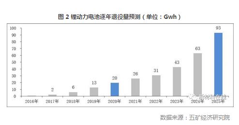 2014 年來,隨著我國新能源汽車行業(yè)的快速發(fā)展,動(dòng)力電池的回收問題也逐漸提上日程。一般動(dòng)力電池會(huì)在 5-6 年后退役,商用車動(dòng)力電池甚至 2-3 年就會(huì)退役。因此,從2018-2019 年開始,我國將會(huì)有大量的動(dòng)力電池進(jìn)入報(bào)廢期。根據(jù)我們的綜合測算,2020 年我國將有約 20Gwh 的動(dòng)力電池退役,2025 年將有大約 93Gwh 的動(dòng)力電池退役。