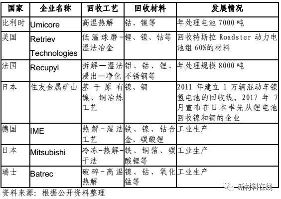 此前,歐美和日本的消費電池、家電電子等回收利用(主要方式是再生利用)取得了良性的發(fā)展,為動力電池的再生利用打下了良好基礎。從動力再生利用的實施主體上看,大多為專業(yè)的金屬冶煉回收企業(yè)或材料企業(yè)轉型而來。比利時優(yōu)美科、美國 Retriev Technologies、法國 Recupyl、日本住友金屬礦山等是全球較為知名的鋰電池再生企業(yè)。