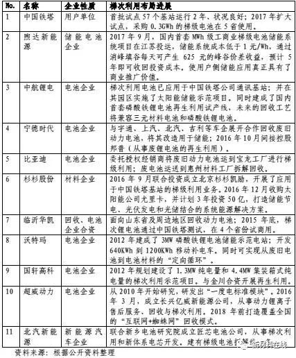 從全球范圍看,鋰動力電池還未到大規(guī)模報廢期。因此,梯級利用總體還處于示范性應用階段?,F(xiàn)有項目大多由汽車企業(yè)主導、聯(lián)合電池企業(yè)及回收企業(yè)實施,少數(shù)企業(yè)已經(jīng)率先實現(xiàn)了商業(yè)化突破。