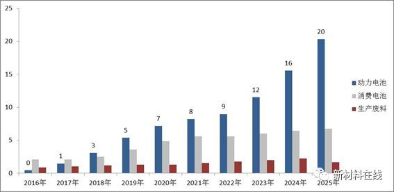 2014 年來,隨著我國新能源汽車行業(yè)的快速發(fā)展,動力電池的回收問題也逐漸提上日程。一般動力電池會在 5-6 年后退役,商用車動力電池甚至 2-3 年就會退役。因此,從2018-2019 年開始,我國將會有大量的動力電池進入報廢期。根據(jù)我們的綜合測算,2020 年我國將有約 20Gwh 的動力電池退役,2025 年將有大約 93Gwh 的動力電池退役。