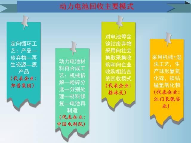 動(dòng)力電池回收主要模式有四種,分別是定向循環(huán)工藝、動(dòng)力電池材料再合成工藝、對(duì)電池等含鎳鈷廢棄物采用向社會(huì)集散采集收購和向企業(yè)收購相結(jié)合的回收模式、采用機(jī)械+濕法工藝,代表企業(yè)分別是邦普集團(tuán)、中國電科院、格林美、江門市長優(yōu)實(shí)業(yè)。