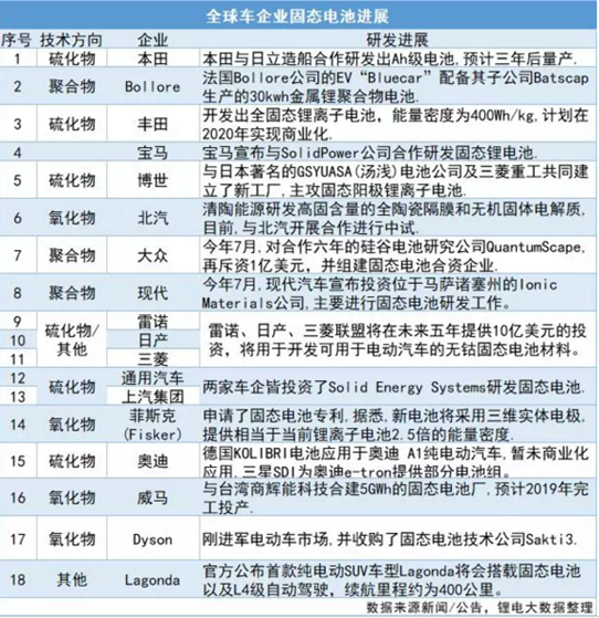 以下是全球18家車企固態(tài)電池研發(fā)進展:
