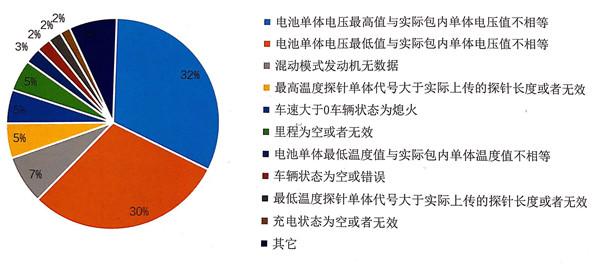 來看一個(gè)實(shí)例,A企業(yè),接入平臺(tái)車輛總數(shù)為29631輛,車輛數(shù)據(jù)出錯(cuò)率為94.4%,單車錯(cuò)誤數(shù)量均值為2883條。具體出錯(cuò)數(shù)據(jù)項(xiàng)有電池單體電壓最高值與實(shí)際包內(nèi)單體電壓值不相等、混動(dòng)模式發(fā)動(dòng)機(jī)無數(shù)據(jù)、車速大于0而車輛狀態(tài)為熄火、里程為空或無效等等。劉鵬分析,“這家企業(yè)出現(xiàn)的動(dòng)力電池相關(guān)數(shù)據(jù)項(xiàng)錯(cuò)誤比重已超過71.7%。動(dòng)力電池作為新能源汽車的關(guān)鍵部件,它的優(yōu)劣直接影響著整車性能,電池?cái)?shù)據(jù)質(zhì)量過差會(huì)直接影響新能源汽車的安全?!?