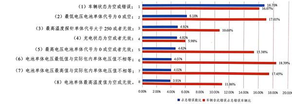 除了以上兩類錯(cuò)誤,其他排名在前的6類錯(cuò)誤均為電池單體問題,包括單體溫度和電壓的錯(cuò)誤,初步判斷為車載信息采集模塊精度較低,傳輸數(shù)據(jù)質(zhì)量較差。從丟包率大于1、30秒內(nèi)里程跳變大于2公里等錯(cuò)誤車輛占比來看,說明車載數(shù)據(jù)采集裝置的精度和傳輸速率都有待改進(jìn)。