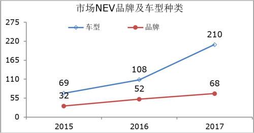 2017年,中國(guó)新能源乘用車銷量為57.9萬(wàn),其中純電動(dòng)汽車有46.8萬(wàn)輛,插電式混合動(dòng)力車為11.1萬(wàn)輛。 2015-2017年,中國(guó)新能源乘用車品牌種類逐年增加,由32個(gè)增至68個(gè),對(duì)應(yīng)車型數(shù)量由69款增至210款。總體呈多樣化趨勢(shì)發(fā)展,整體走勢(shì)良好。