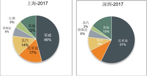 深圳地區(qū)對(duì)新能源汽車推廣力度較大,深圳提出到2020年全部出租車和公交車都為純電動(dòng)汽車,且新注冊(cè)的網(wǎng)約車必須為新能源汽車;但其比亞迪特色非常明顯,出租車均為比亞迪e5車型,私家車中比亞迪占比也較高。