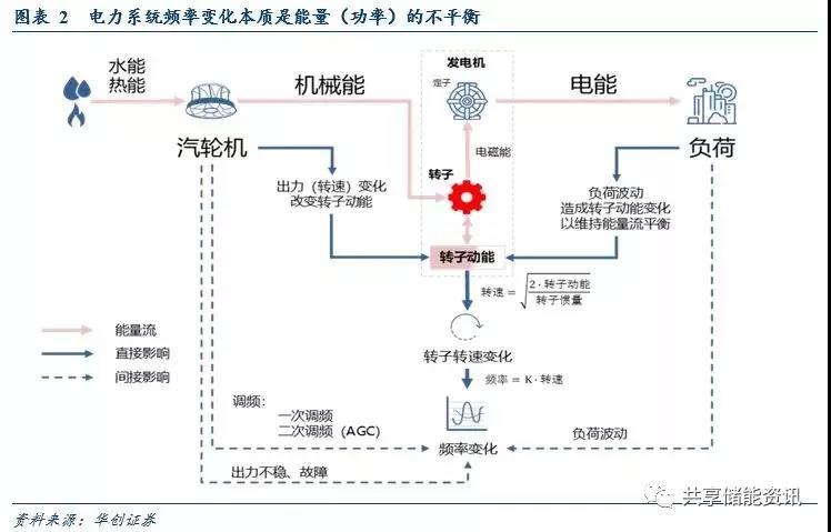 電網(wǎng)頻率變化是電網(wǎng)功率不平衡的累計(jì)結(jié)果。 大型同步發(fā)電機(jī)是我國(guó)電力系統(tǒng)的主要電源形式,其轉(zhuǎn)子轉(zhuǎn)速與發(fā)電頻率密切相關(guān)。而轉(zhuǎn)子轉(zhuǎn)速的變化,主要由于其動(dòng)能的變化, 當(dāng)轉(zhuǎn)子的輸入能量(機(jī)械能)與輸出能量(電磁能)不一致時(shí),就會(huì)影響其自身的動(dòng)能,造成了轉(zhuǎn)速變化,進(jìn)而改變了發(fā)電頻率。 因此,電網(wǎng)頻率變化實(shí)際上是電網(wǎng)功率不平衡累計(jì)的結(jié)果, 需要不斷的通過“調(diào)頻”進(jìn)行不斷地修正。
