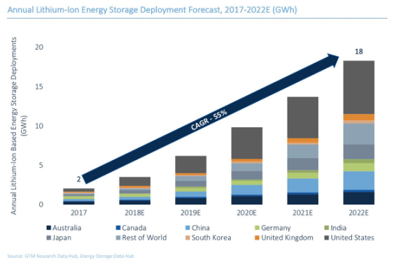 換句話說,鋰離子電池儲(chǔ)能系統(tǒng)將從2017年的2千兆瓦時(shí)增加到2022年的18千兆瓦時(shí),將增長(zhǎng)8倍以上。