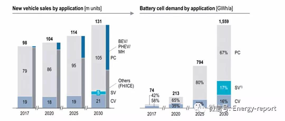 預(yù)計(jì)全球xev的銷量在未來(lái)10年內(nèi)將大幅增長(zhǎng)。推動(dòng)這一發(fā)展的主要因素是中國(guó)和歐盟的監(jiān)管框架,這些框架遵循嚴(yán)格的二氧化碳減排路徑。因此,對(duì)電池的需求預(yù)計(jì)將在距離今天的基地不遠(yuǎn)的幾年內(nèi)成倍增長(zhǎng)??傮w而言,汽車乘用車(pc)的需求預(yù)計(jì)將從2017年的74兆瓦增長(zhǎng)到2030年的約1,050兆瓦。