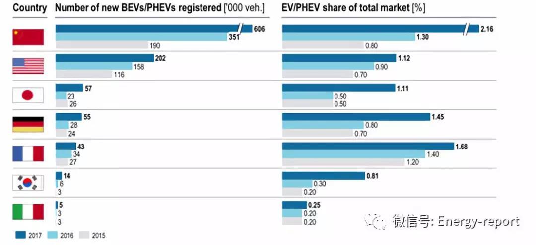 在經(jīng)歷了2016年的一段停滯之后,日本市場(chǎng)現(xiàn)在正急劇回升,并實(shí)現(xiàn)了高速增長(zhǎng)。和日本一樣,韓國(guó)也經(jīng)歷了三位數(shù)的增長(zhǎng)率,但由于xEVs汽車在市場(chǎng)中所占的份額還不到1%,韓國(guó)正處在第六位。意大利仍在等待其市場(chǎng)達(dá)到任何顯著的增長(zhǎng)水平,部分原因是缺乏國(guó)產(chǎn)原委托制造商提供的電動(dòng)車型,2017年xEVs汽車在其新車注冊(cè)中所占份額為0.25%(圖8)