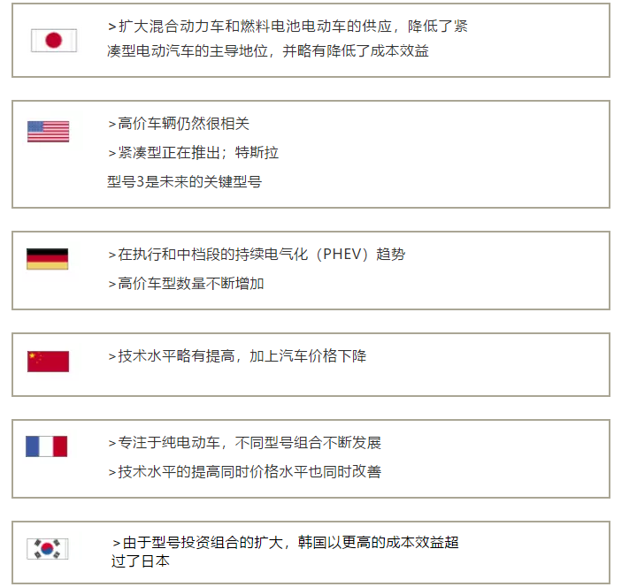 法國(guó)維護(hù)了自己在技術(shù)方面的領(lǐng)先地位。法國(guó)原委托制造商已經(jīng)擴(kuò)大了他們相對(duì)狹窄的產(chǎn)品范圍,推出了一些插電式混合動(dòng)力電動(dòng)汽車(PHEVs),但仍然主要關(guān)注于提供高性價(jià)比的低成本小型電動(dòng)汽車(BEVs)。德國(guó)汽車制造商的投資組合反映了向插電式混合動(dòng)力電動(dòng)汽車和電池電動(dòng)運(yùn)動(dòng)多功能車(suv)的轉(zhuǎn)變,而且車型更多。這使得分析過(guò)的車輛的技術(shù)性能略有下降。因此,與去年相比,德國(guó)有所失勢(shì),但仍能在技術(shù)領(lǐng)域保持第二的位置。德國(guó)原裝設(shè)備制造商在不久的將來(lái)宣布并計(jì)劃大量推出新的xEV車型,這導(dǎo)致預(yù)計(jì)在即將進(jìn)行的評(píng)估中指標(biāo)技術(shù)將會(huì)增加。