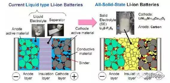目前商業(yè)化的鋰離子電池電解液是液態(tài)的,因此也被稱為液態(tài)鋰離子電池。簡單來說,全固態(tài)鋰離子電池就是指電池結(jié)構(gòu)中所有部件都是以固態(tài)形式存在,把傳統(tǒng)鋰離子電池的液態(tài)電解液和隔膜替換為固態(tài)電解質(zhì)。