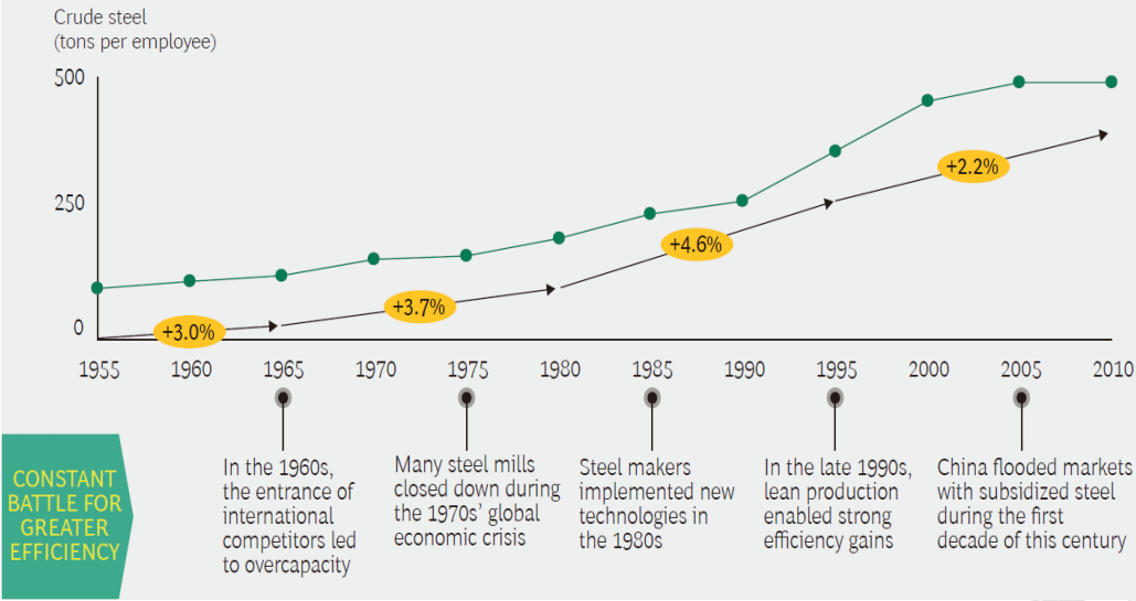 有人可能會(huì)說(shuō),一般制造業(yè)不能作為電力行業(yè)的典型參考案例,因?yàn)樗馁Y本密集程度要低得多。但兩大資本密集型行業(yè)(化工和鋼鐵)的經(jīng)驗(yàn)也證實(shí)了一種觀點(diǎn),即發(fā)電企業(yè)可以通過(guò)一系列的能效提升手段,使生產(chǎn)率顯著增長(zhǎng)。在過(guò)去的 15 年中,歐洲化學(xué)工業(yè)的勞動(dòng)生產(chǎn)率以每年超過(guò) 2%的速度增長(zhǎng)。到 2000 年,化工行業(yè)通過(guò)專(zhuān)注于核心業(yè)務(wù),剝離外圍業(yè)務(wù),實(shí)現(xiàn)了高度整合。在接下來(lái)的 10 年,面對(duì)中國(guó)的競(jìng)爭(zhēng)和全球經(jīng)濟(jì)低迷,化工企業(yè)認(rèn)識(shí)到,必須更深刻的思考如何提高經(jīng)營(yíng)效率。全廠優(yōu)化、專(zhuān)業(yè)化和過(guò)程自動(dòng)化都是驅(qū)動(dòng)行業(yè)生產(chǎn)率增長(zhǎng)的有效手段。在德國(guó),鋼鐵行業(yè)在過(guò)去半個(gè)世紀(jì)里提高了大約三倍的生產(chǎn)率,經(jīng)受住了幾次危機(jī)的考驗(yàn)。鋼鐵制造商通過(guò)采用新技術(shù)和精益生產(chǎn)系統(tǒng)來(lái)促進(jìn)持續(xù)改進(jìn),從而適應(yīng)成本的快速削減。