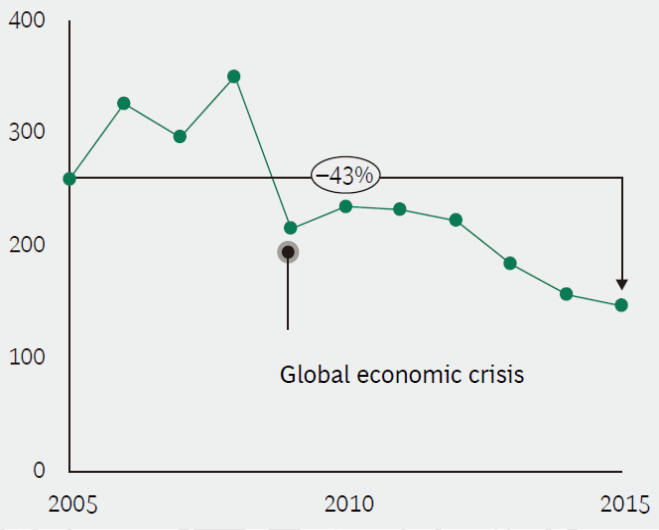 受行業(yè)重大變革影響,歐洲的傳統(tǒng)發(fā)電企業(yè)一直如履薄冰。在過(guò)去 10 年間,受產(chǎn)能過(guò)剩導(dǎo)致的利用小時(shí)數(shù)和上網(wǎng)電價(jià)大幅下降影響,發(fā)電企業(yè)承受著巨大的市場(chǎng)競(jìng)爭(zhēng)壓力。自 2005 年以來(lái),歐洲十大發(fā)電企業(yè),自 2005 年以來(lái),歐洲十大發(fā)電企業(yè)由化石燃料、核電或水力發(fā)電所構(gòu)成的裝機(jī)中,設(shè)備利用水平下降了 14%,每兆瓦裝機(jī)容量的年?duì)I收實(shí)際降幅已經(jīng)超過(guò)了 40%,同時(shí),發(fā)電企業(yè)的股價(jià)表現(xiàn)不佳,信用評(píng)級(jí)也在下跌。許多其他地區(qū)的生產(chǎn)商也正面臨相似的挑戰(zhàn)。
