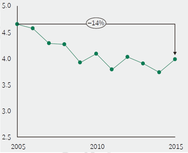 雖然有一定地區(qū)性差別,但歐洲各地以及其他地區(qū)也出現(xiàn)了類(lèi)似的影響。雖然可再生能源的增長(zhǎng)勢(shì)頭強(qiáng)勁,但過(guò)去十年,歐洲十大生產(chǎn)商并沒(méi)有大幅削減其常規(guī)機(jī)組的發(fā)電能錄。盡管可用于銷(xiāo)售的常規(guī)發(fā)電能量從 2005 年到 2015 年下降了 9%,但常規(guī)發(fā)電能力總體上增加了 7%。在這十年期間,設(shè)備利用率下降了 14%,經(jīng)通脹因素調(diào)整后,每千兆瓦裝機(jī)容量的年收入下降了 43%。