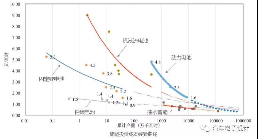 目前抽水蓄能成本最低,單位儲(chǔ)能投資約 770 元;鉛酸電池成本略高,為 900 元 / 千瓦時(shí);電動(dòng)汽車動(dòng)力電池與儲(chǔ)能用鋰離子電池成本相近,在 1550-1600 元 / 千瓦時(shí)之間。但就成本下降趨勢(shì)來看,動(dòng)力電池及儲(chǔ)能用鋰離子電池成本下降速度更快