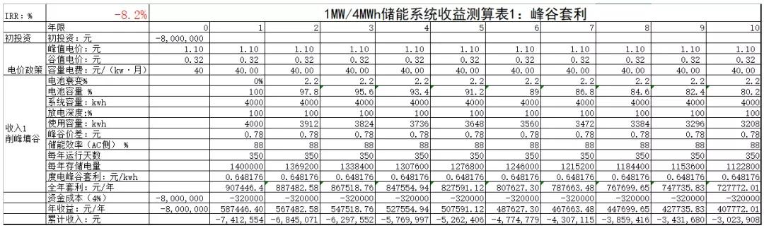測算表2的結(jié)果顯示,系統(tǒng)綜合靜態(tài)回收期在8年以內(nèi),內(nèi)部收益率4.9%,雖偏低,但可通過調(diào)節(jié)儲能小時數(shù)來顯著提升收益狀況,比如1MW/3MWh系統(tǒng)的IRR=8.4%,回收期7年以內(nèi),1MW/2MWh系統(tǒng)的IRR=14.7%,回收期5年以內(nèi),相當(dāng)可觀。